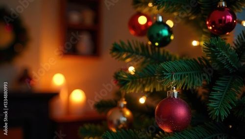 Warmly lit Christmas tree with ornaments and candles, holiday, lights, atmosphere