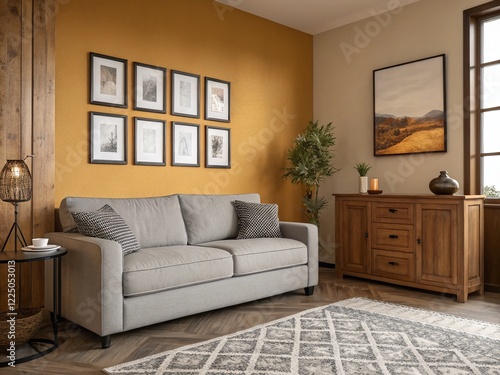 Warm-Toned Living Room Mockup: Empty Canvas Frames on Wall, Gray Sofa, Wood Cabinet