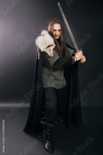 Warrior in chain mail and with a sword in a black cloak. Handsome guy with long hair and a beard in armor with weapons. Knight on a dark background. Studio photography