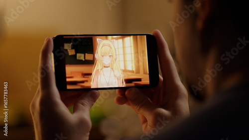 Watching Japanese anime with cute anime girls on smartphone with kitchen in background
