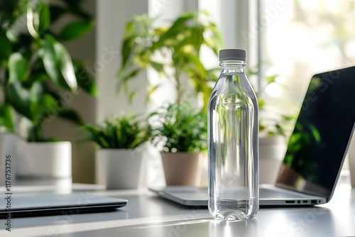 Water Bottle On Desk And Man In Foreground Using Computer