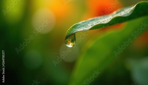 Water Drop Hanging From Leaf Tip in Garden Close Up