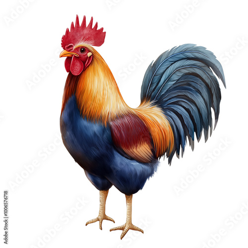 Watercolor chickens and a rooster standing in the grass on a transparent background with the png file