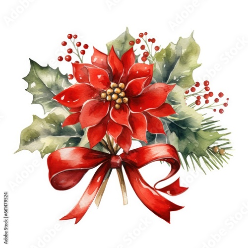 Watercolor Christmas bouquet with poinsettia, fir branches, berries, holly, berries. Hand painted illustration isolated on white background , ai generative