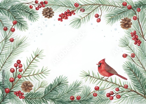 Watercolor Christmas Frame Pine Branches, Berries, Cardinal Bird