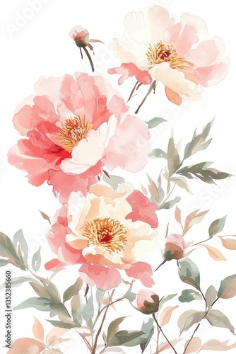 Watercolor depiction of beautiful vibrant pink flowers with green leaves
