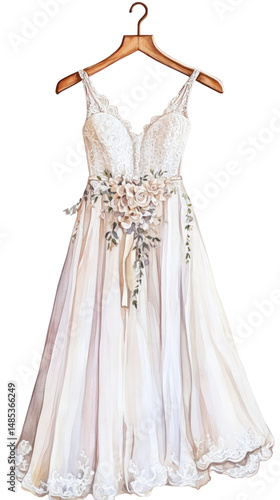 Watercolor Elegant Bridal Gown on Hanger Clipart — Wedding Dress Illustration on Transparent Background