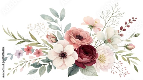 Watercolor floral bouquet isolated on white background, featuring roses and delicate flowers, perfect for wedding decorations and elegant designs