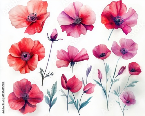 Watercolor Floral Collection of Poppy and Rose Flowers with Leaves on White Background