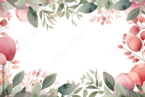Watercolor floral frame with pink flowers and green leaves on white background.