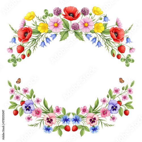Watercolor floral garland with poppies, strawberries, and pansies isolated on transparent background