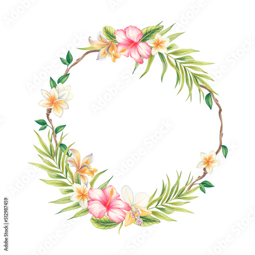 Watercolor floral illustrations - a wreath with tropical green leaves and bright flowers, for wedding gifts, greetings, wallpapers, fashion, backgrounds, textures, crafts, wrappers, postcards, etc.