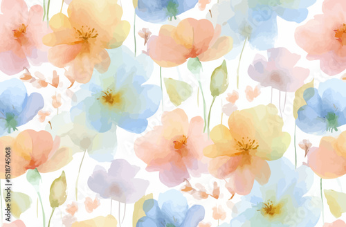 Watercolor Floral Seamless Pattern Pastel Peach, Blue Flowers