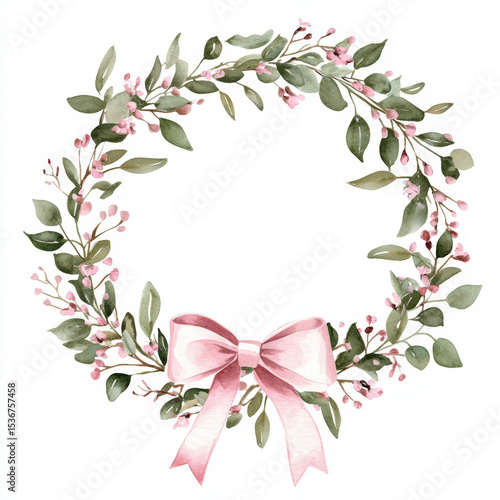 Watercolor Floral Wreath With Pink Bow. Watercolor wreath featuring green leaves, pink berries, and a lovely pink bow. Perfect for a shirt design.