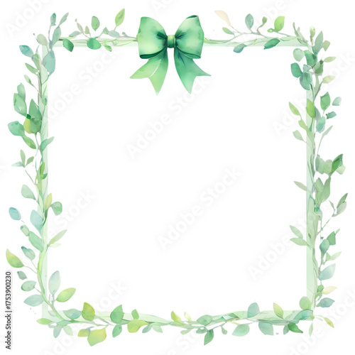 Watercolor frame of green leaves and vines with a green bow on top isolated on a black background on transparent background