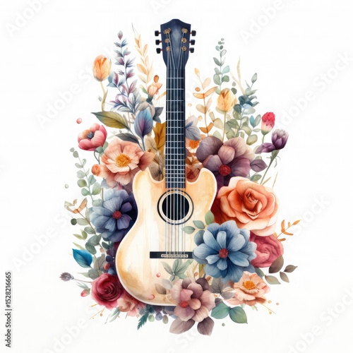 Watercolor Guitar Among The Love Of Flowers, clipart Illustration, Generative Ai
