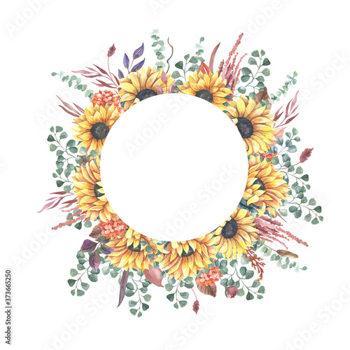 Watercolor hand painted floral sunflower fame.Watercolor floral illustration with sunflowers - for wedding invite, stationary, greetings, wallpapers, background.