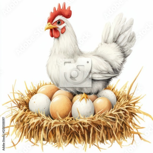 watercolor illustration of a brown hen sitting beside speckled eggs on a straw nest, exuding rustic countryside charm.