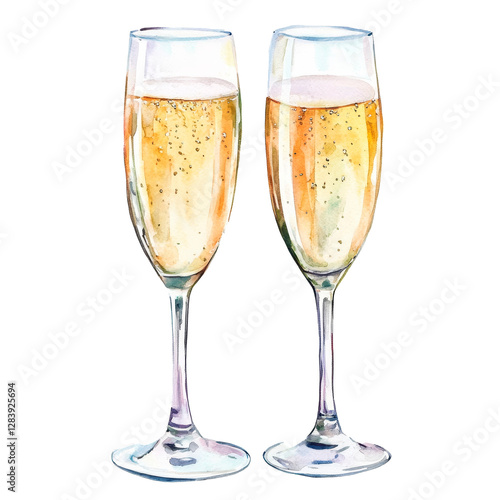 Watercolor illustration of a champagne glass with a festive drink and a decorative bow on a white background. Elegant and artistic, perfect for menus, invitations, packaging, and editorial use