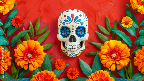 Watercolor illustration of a festive Day of the Dead altar with colorful sugar skulls and marigolds bright simple watercolour background