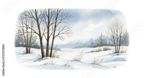 Watercolor illustration of a winter landscape featuring snow covered ground and trees