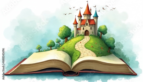 Watercolor illustration of fantasy castle perched atop grassy hill opening from book. Stone path winds towards castle entrance, surrounded by trees, birds flying in soft blue sky. Artwork captures