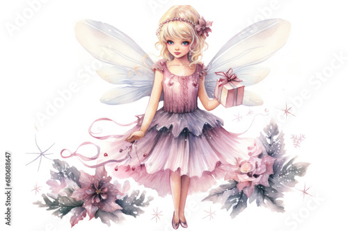 Watercolor Illustration of magical fairy with wings in pink dress with gifts and flowers. Princess girl. Beautiful Angel. For children book, postcards, kid decor, scrapbooking, greeting.