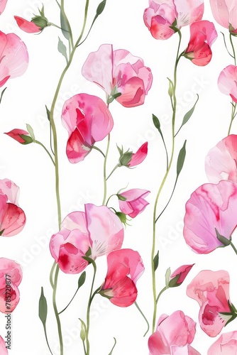 watercolor illustration of pink sweet pea flowers on white background, summer botanical vertical pattern for background, wallpaper, fabric and textile