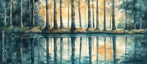 Watercolor illustration of tree trunks reflected on the surface of a lake