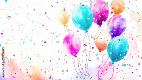 Watercolor illustrations of cute balloons in various pastel colors floating on a background full of delicate confetti. Balloons in various shapes and patterns on a light background