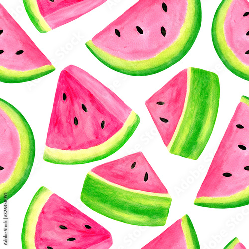 Watercolor juicy watermelon slice seamless pattern. Hand drawn colorful illustration isolated on white background for decoration, packaging, wrapping, cards, design.