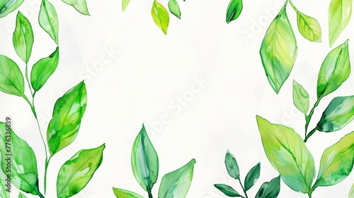Watercolor leaves border with copy space on a white background. Botanical illustration style. Green leaf border in watercolor for fresh and natural design themes