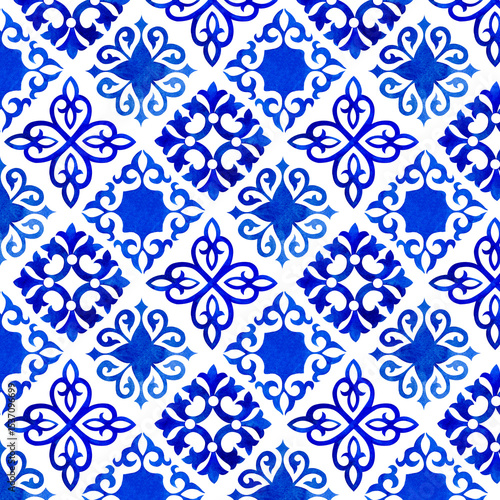 Watercolor Mediterranean Amalfi Coast Seamlesspattern. Ceramic tile. Portuguese, Sicilian, Spanish tile traditional design. Backdrop for wrapping paper, wallpaper, fabric, textile.