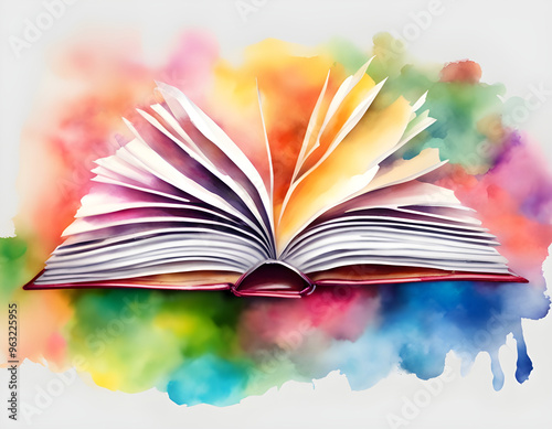 watercolor Open book, hardback books on bright colorful background.