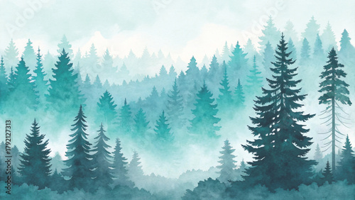 watercolor painting of a misty pine forest, soft layers of evergreen trees fading into the fog Vector background