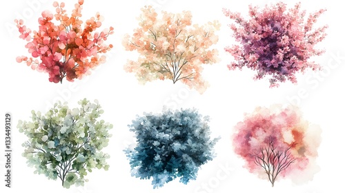 Watercolor paintings of varied colorful bushes arranged in a pattern