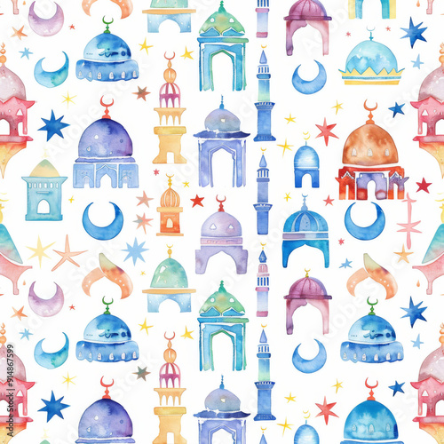 Watercolor pattern with Islamic architecture, mosques, crescent moons, stars, background