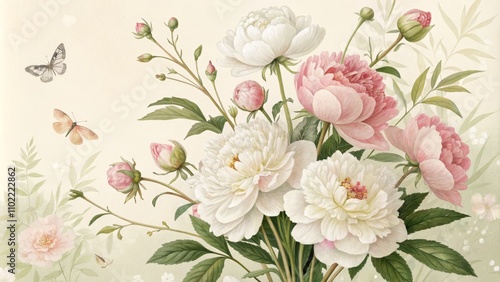 Watercolor Peony Bouquet with Butterflies, Floral Art, Nature, Botanical , peony, butterfly