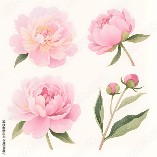 Watercolor peony flower clipart set with pink blooms, buds, and green leaves
