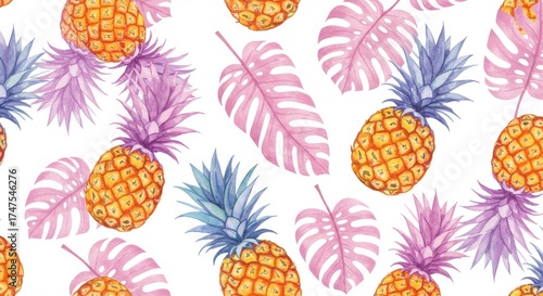 Watercolor pineapple and tropical leaves seamless pattern on white background