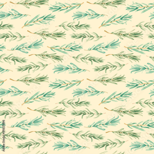 Watercolor Rosemary pattern seamless, green rosemary decoration, craft label design bio food, vegetarian natural banner, restaurant menu background.