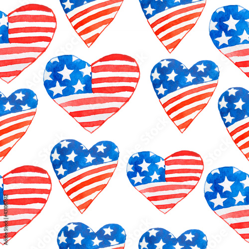 Watercolor seamless hand drawn pattern for US Independence day 4th fourth of July patriotic background hearts love print. Red blue white colors stripes stars design, celebration summer party.