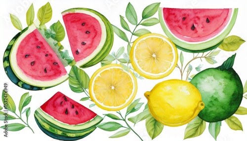 watercolor seamless of lemon citrus watermelon and lime with leaves isolated on white background