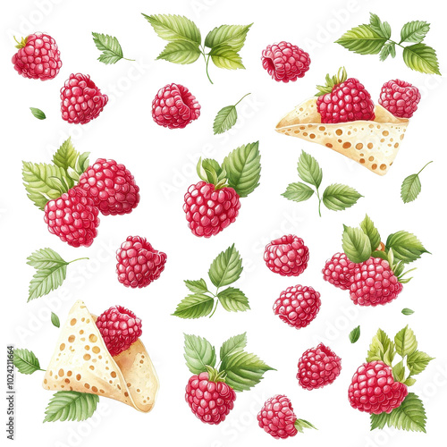 Watercolor seamless pattern of raspberry crepes, isolated on a white background, artistic and visually appealing. PNG