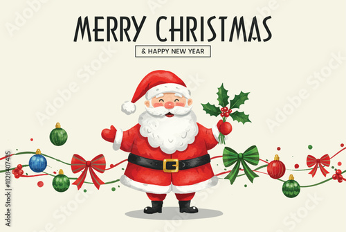 Watercolor Style Santa Claus Holding Holly, Merry Christmas and Happy New Year Vector Illustration Template with Ornaments and Ribbons