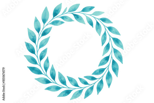 Watercolor teal foliage wreath, circular frame with natural leaf branches, transparent background