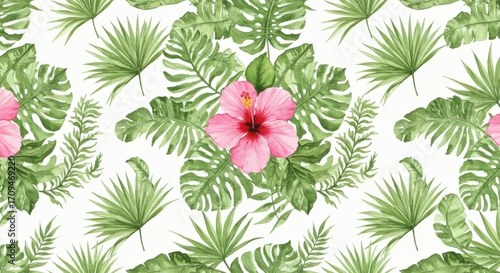 Watercolor Tropical Pattern: Pink Hibiscus Green Leaves White Background.
