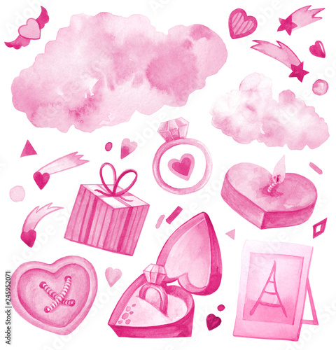Watercolor Valentine's day collection. Romantic pink elements isolated on white. Propose ring, gift, cloud, candle, photo frame, heart. Set perfect for gift cards, collages and other design purposes