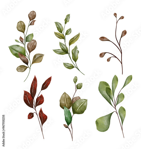 Watercolor vector branches with leaves, isolated fall season decor elements on white background.
