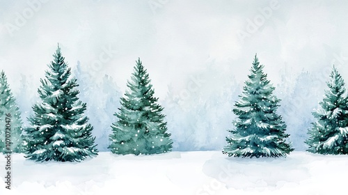 Watercolor Winter Forest Landscape with Snow Covered Trees.